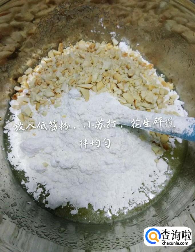 然后放入低筋面粉、小苏打和花生米,搅拌均匀,如下图所示。