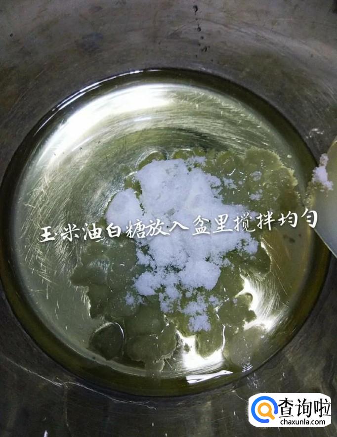 然后在一个容器当中加入玉米油和白糖,搅拌均匀,如下图所示。