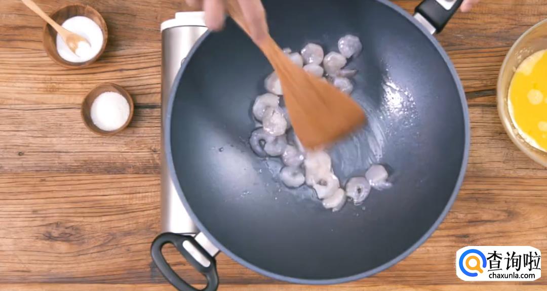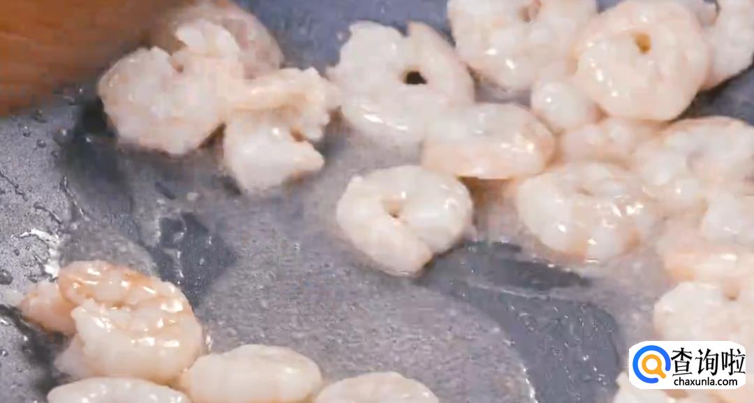 热锅起油,下虾仁,翻炒至变色即可。