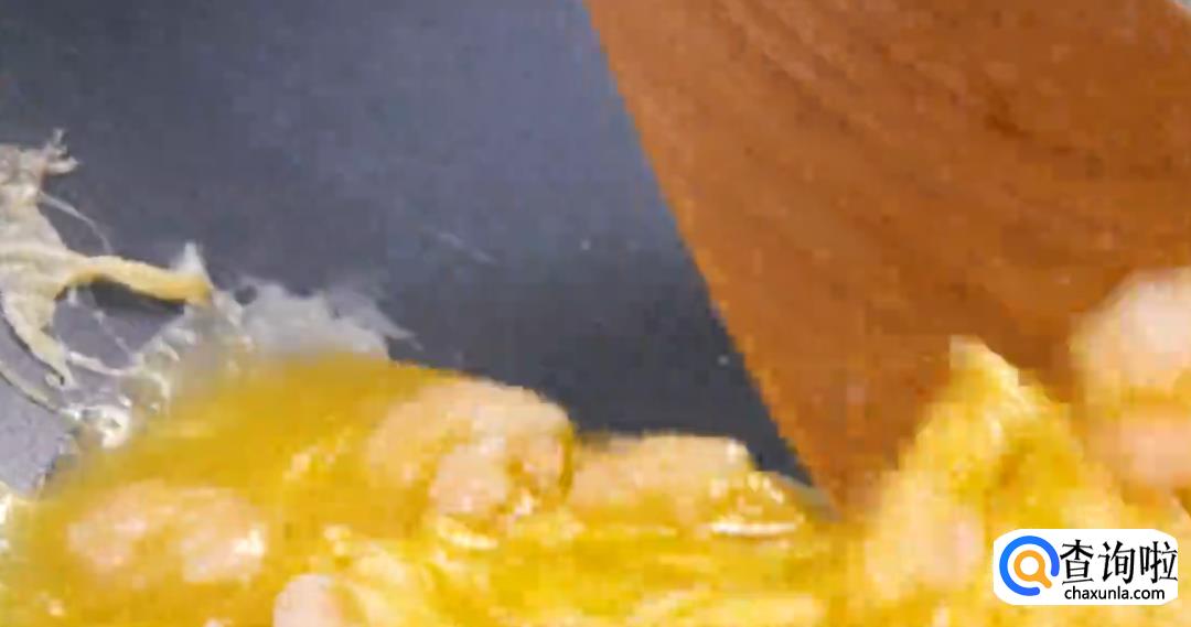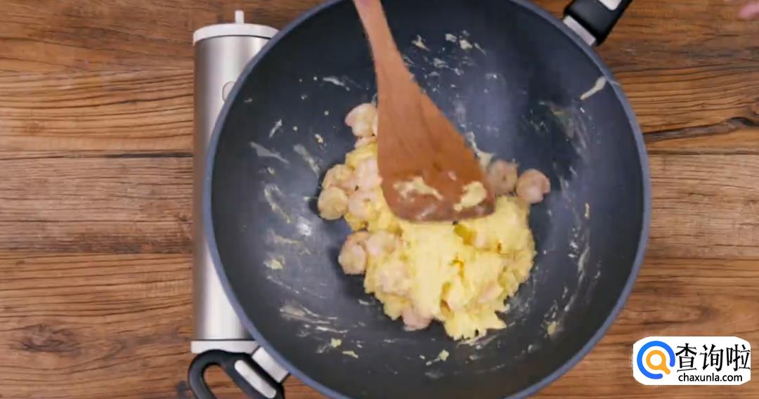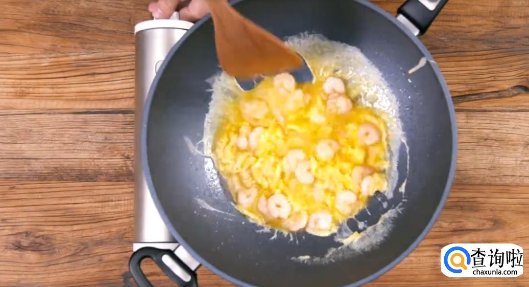 2、虾仁炒熟了,蛋液倒进去,稍微有一点凝结就要关火。