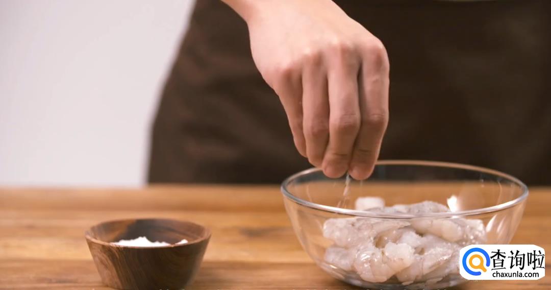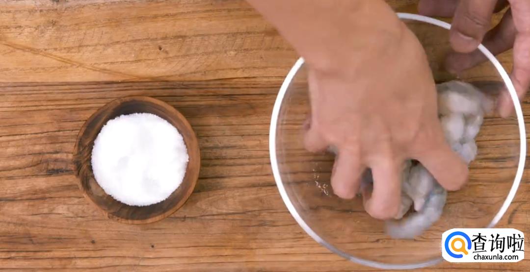 将处理好的虾肉放入盐巴,然后用手抓匀腌制5分钟。