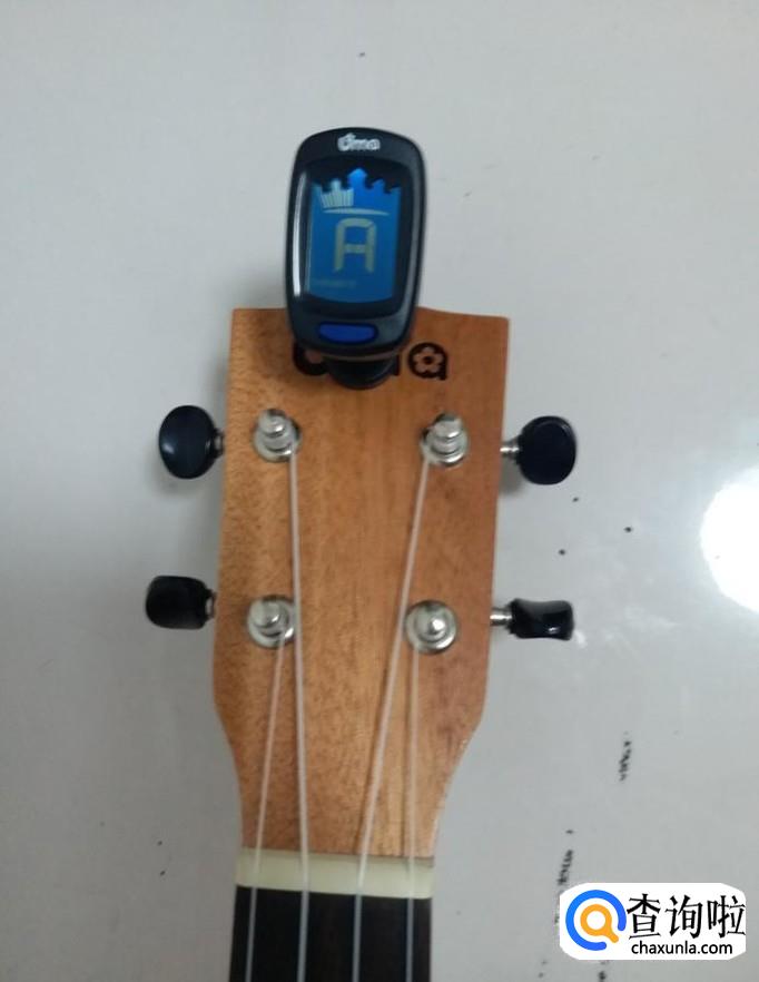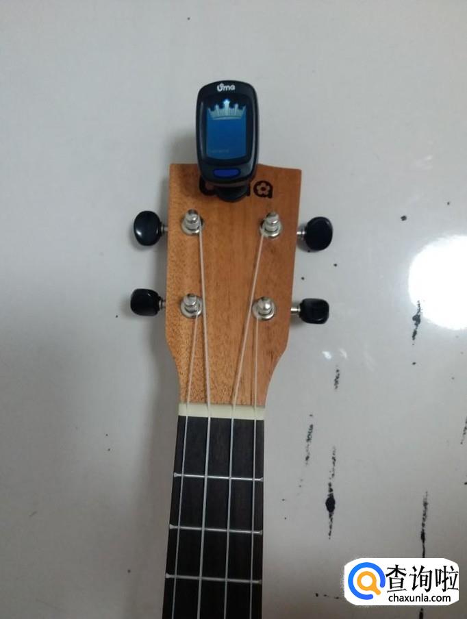 然后我们将调音器夹在琴头上。