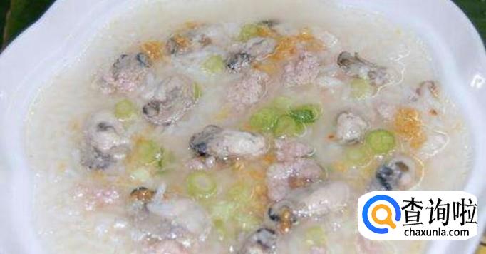 鸭蛋牡蛎粥,将咸鸭蛋和粳米煮粥,熟时捞起咸鸭蛋去壳,切碎和干牡蛎一起放人粥内一切煮五分钟即可