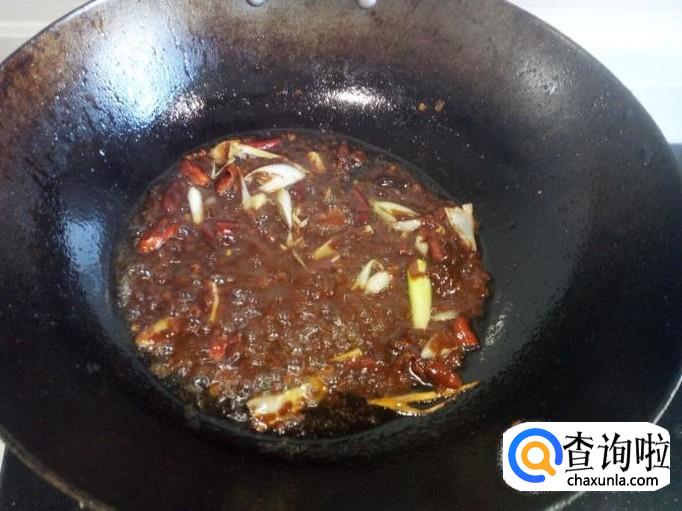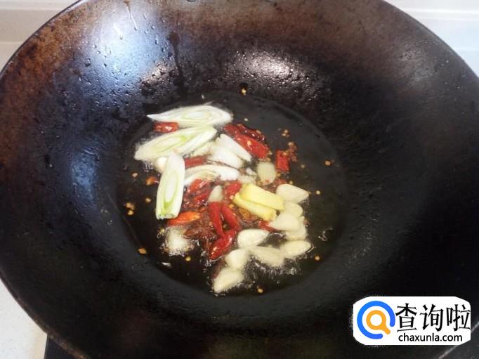 锅内放入油加热,油热后先放入花椒,红干椒爆香,再放入葱,姜,蒜,翻炒(小火)。
