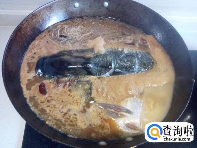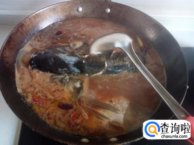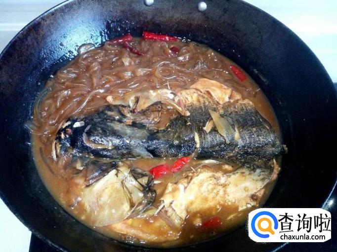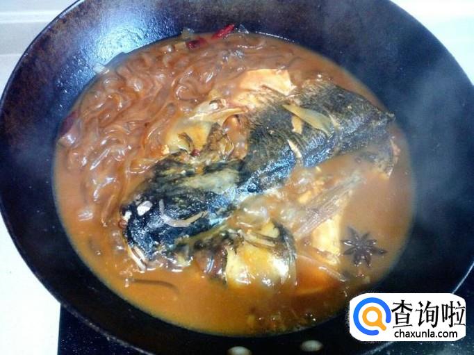 炖的过程中,用勺把汤汁往鱼头上浇一下,便于入味。把粉条翻动一下,避免粘锅。