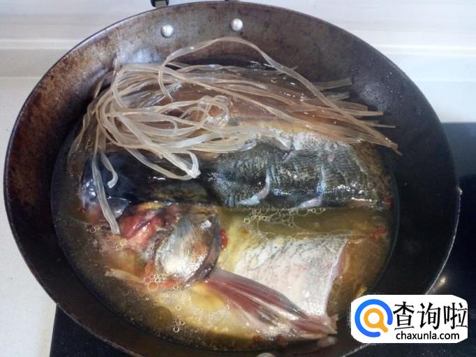 把鱼头放入锅中,填入清水,水没过鱼头。放入泡好的粉条,转大火烧开后,再转小火慢炖。