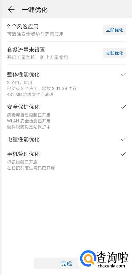 优化完毕可以直接点击完成返回上一个界面,如果系统给出了进一步优化建议,可以再选择单独的项目优化。