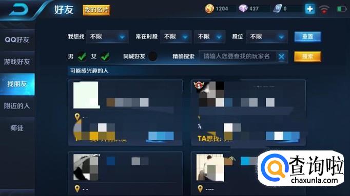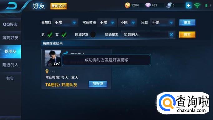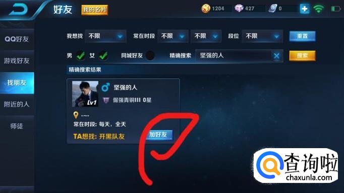 此时可以明显看见你搜出的该玩家的一些信息,然后点击“加好友”。