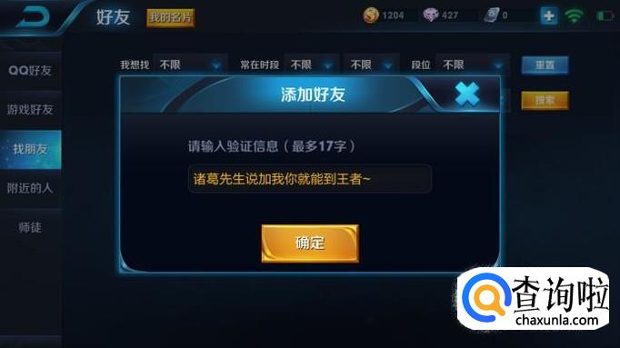在弹出的好友验证框里输入验证信息,如下图所示为系统默认的验证信息。但是你也可以编辑自己想说的话,在输入验证信息后点击确定。