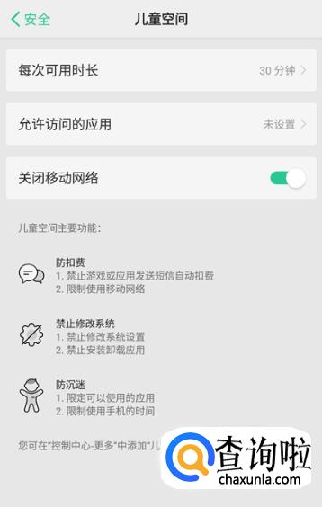 在这里可设置每次限制使用时间,限制使用的应用。如果怕流量超标还可以在这里直接关闭掉移动网络