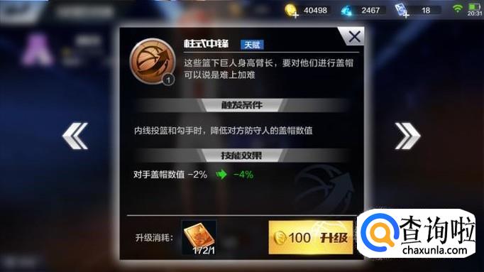 作为一个内线,柱式中锋也是中锋必备的天赋,周琦拥有此项天赋,可以有效降低对方盖帽的能力。