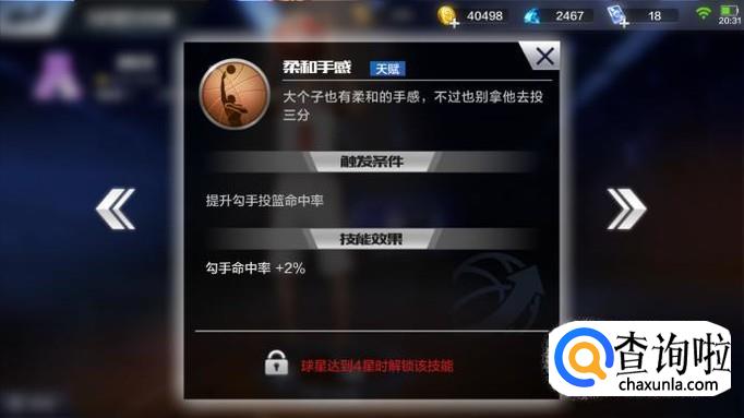 因为内线的属性,所以拥有遮天蔽日的天赋,能够增强对抗,降低对方隔扣自己的概率,防止自己成为背景板。