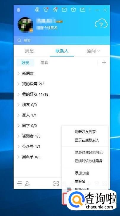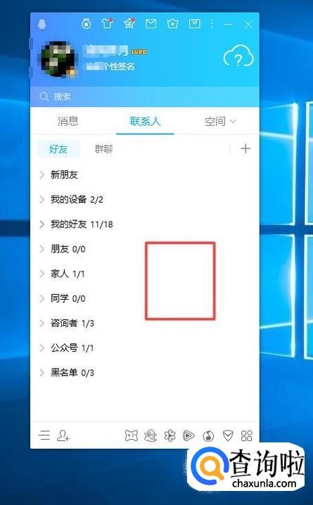 首先,我们打开我们的电脑,然后我们登录我们电脑上面的QQ,进入QQ后,我们右击联系人界面的空白处;