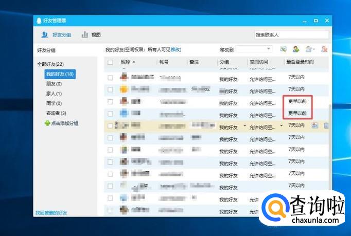 弹出的界面,我们看到最后登录时间,时间显示为更早以前,这样的QQ好友基本上已经不用这个QQ号了;