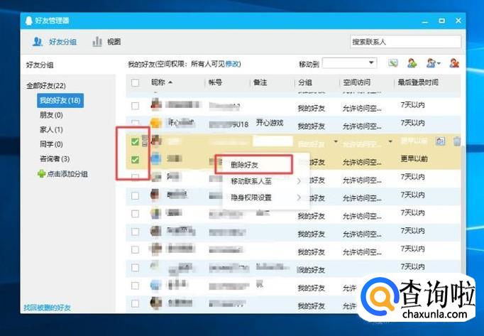 我们勾选上这些最后登录时间为更早以前的好有,然后我们右击选择删除好友就可以了。