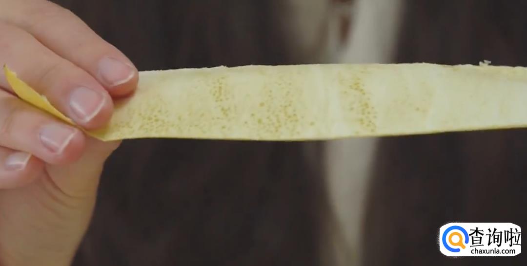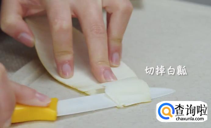 将柚子皮剥下来后,用刀切掉柚子皮上的白瓤,尽量把白瓤都去掉。