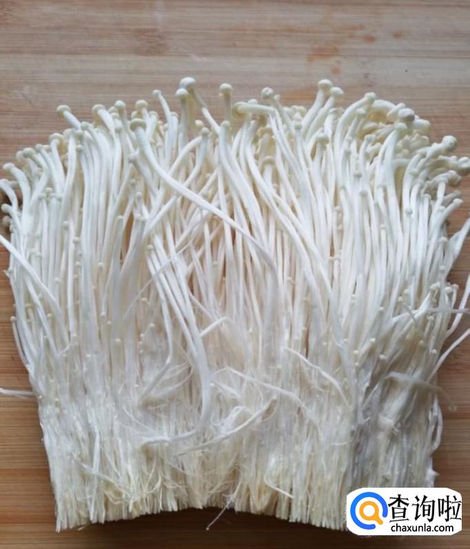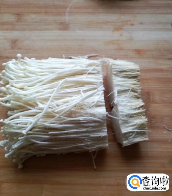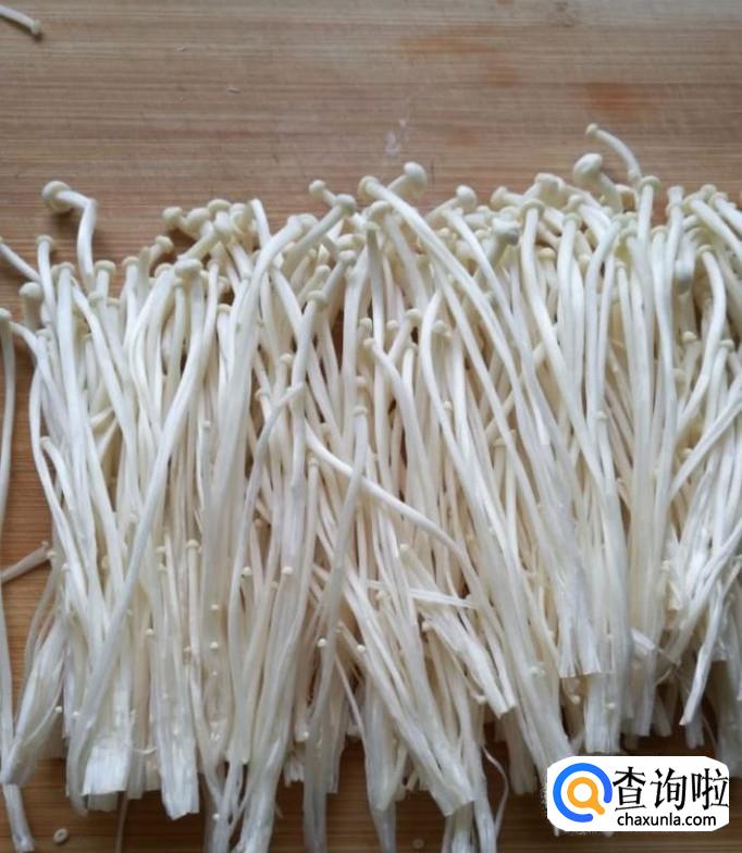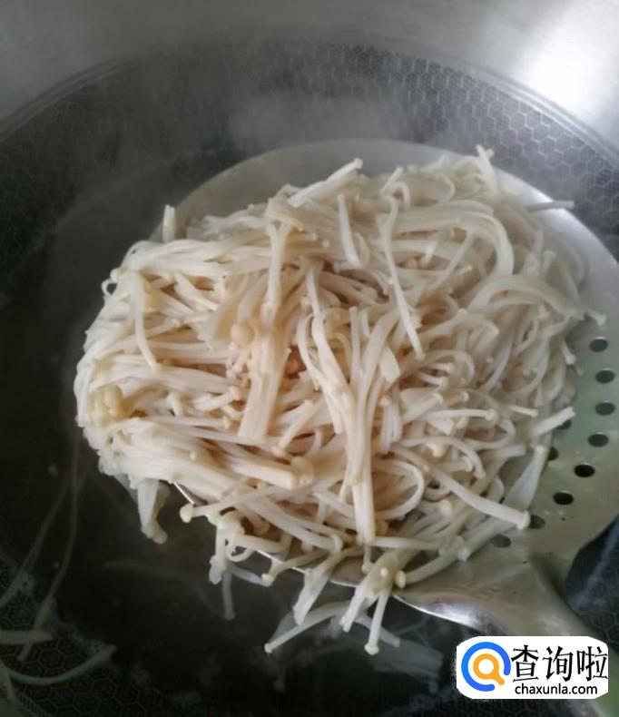 然后我们将金针菇切去根部,用手撕成条状,清洗干净,放入热水锅中煮两分钟捞出,放入凉水中过凉,控干水分备用