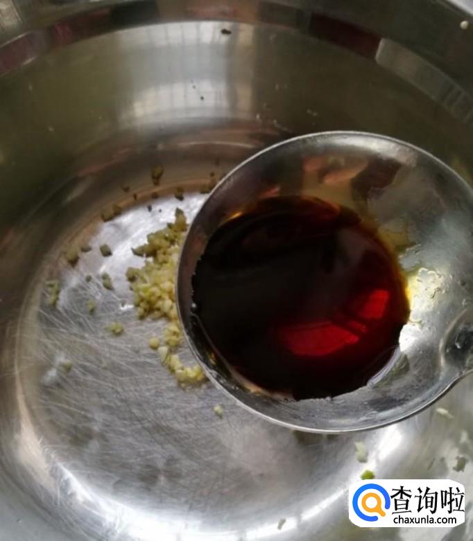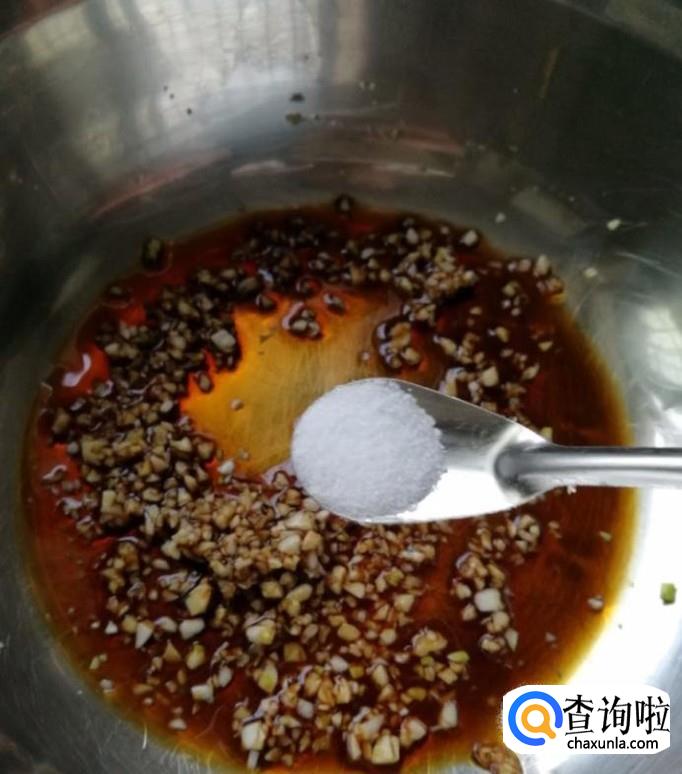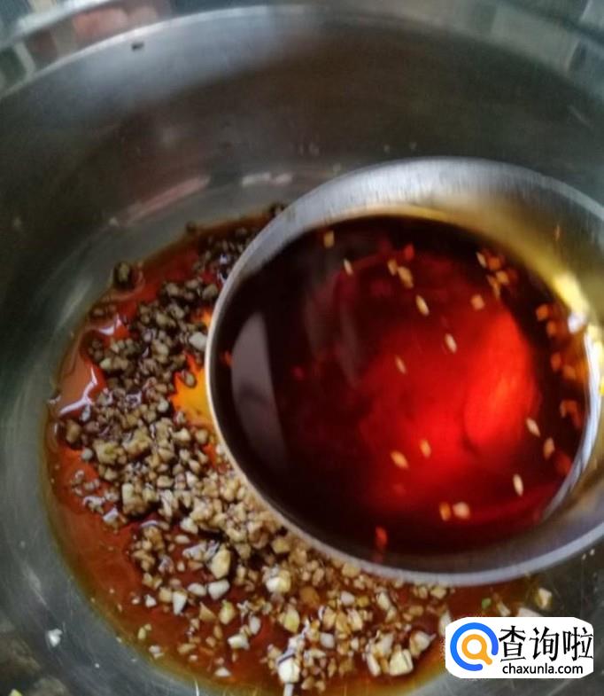 接着我们开始调汁,在一个盆中加入适量的蒜末,倒入适量的鲜味汁,辣鲜露,醋,盐,鸡精,白糖,再倒入一勺辣椒油,搅拌均匀