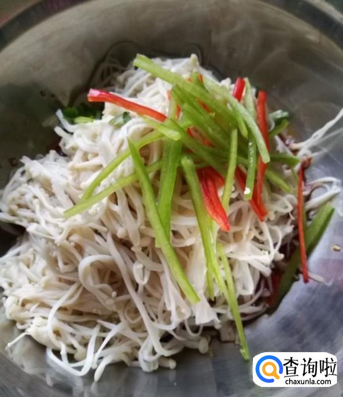 然后我们将青红椒丝放入金针菇中,再倒入调好的料汁,放一点香菜段,搅拌均匀