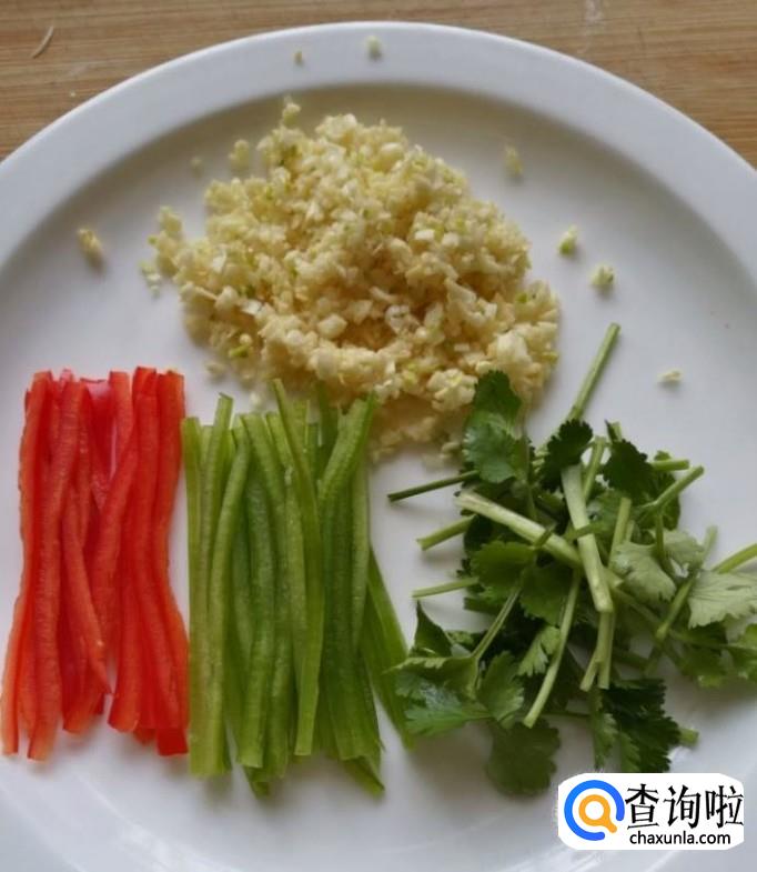 首先我们准备一些蒜末,青红椒丝,香菜段,金针菇