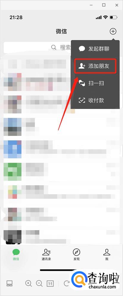 打开微信,点击右上角的添加朋友。