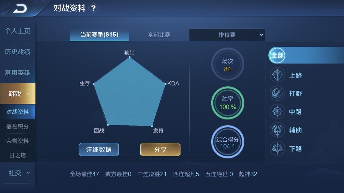 使用擅长的位置和英雄:为了提高我们的KDA分值,或者说提高我们的游戏胜率,更好的提升我们的游戏段位的话,我建议大家选择自己玩的比较多比较擅长的位置和英雄,会更好一点。