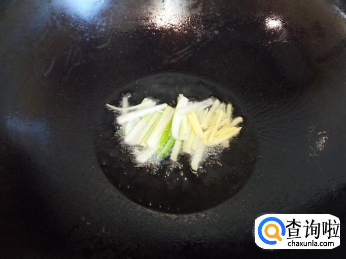 锅里放入油加热,油热后放入葱,姜爆锅,放入胡萝卜丝翻炒,放入五香粉,一小匙儿蚝油。