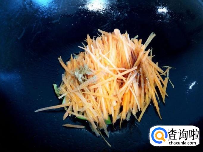 炒至胡萝卜丝变软,放入韭黄翻炒,放入盐。炒至韭黄断生,放入炒好的鸡蛋。