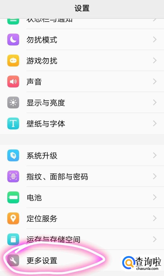 点击“设置”菜单,进入后,向下滑,可以看到“更多设置”四个字,点击更多设置。