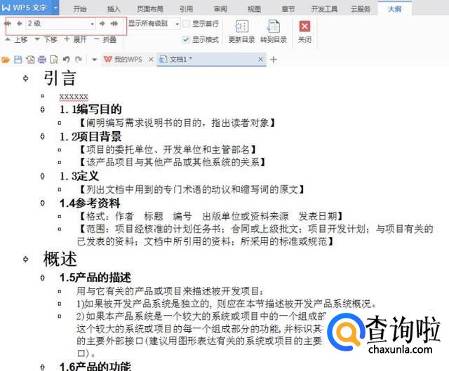 在如下图红色方框位置,确定1级目录、2级目录、3级目录、正文。可以先选择【引言】这个文字,引言是1级目录,就选择1级。【1.1编写目的】是2级目录,就选择2级;【阐明编写需求说明书的目的,指出读者对象】为正文,就选择正文文字。接下来也是一样,以此类推。