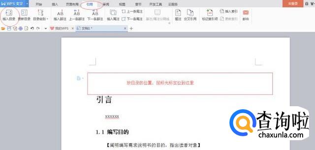 确定放置目录的位置,鼠标光标定位到光标所指的地方,然后点击工具栏上方的【引用】,下方的【插入目录】,会弹出一个【目录】窗口,直接点击【确认】就可以了。