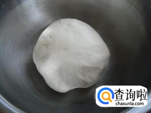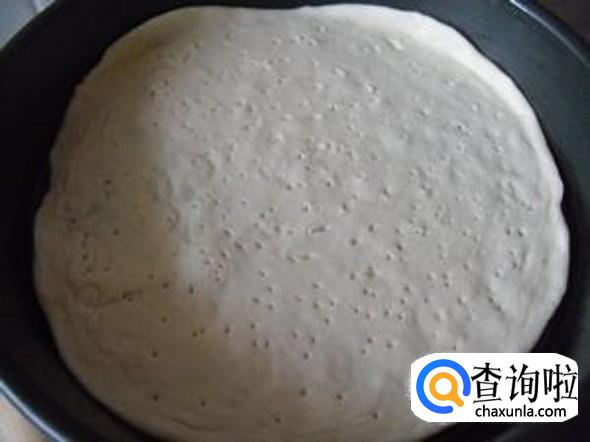 将面团揉好后摊在锅中放好,并做出披萨的形状。