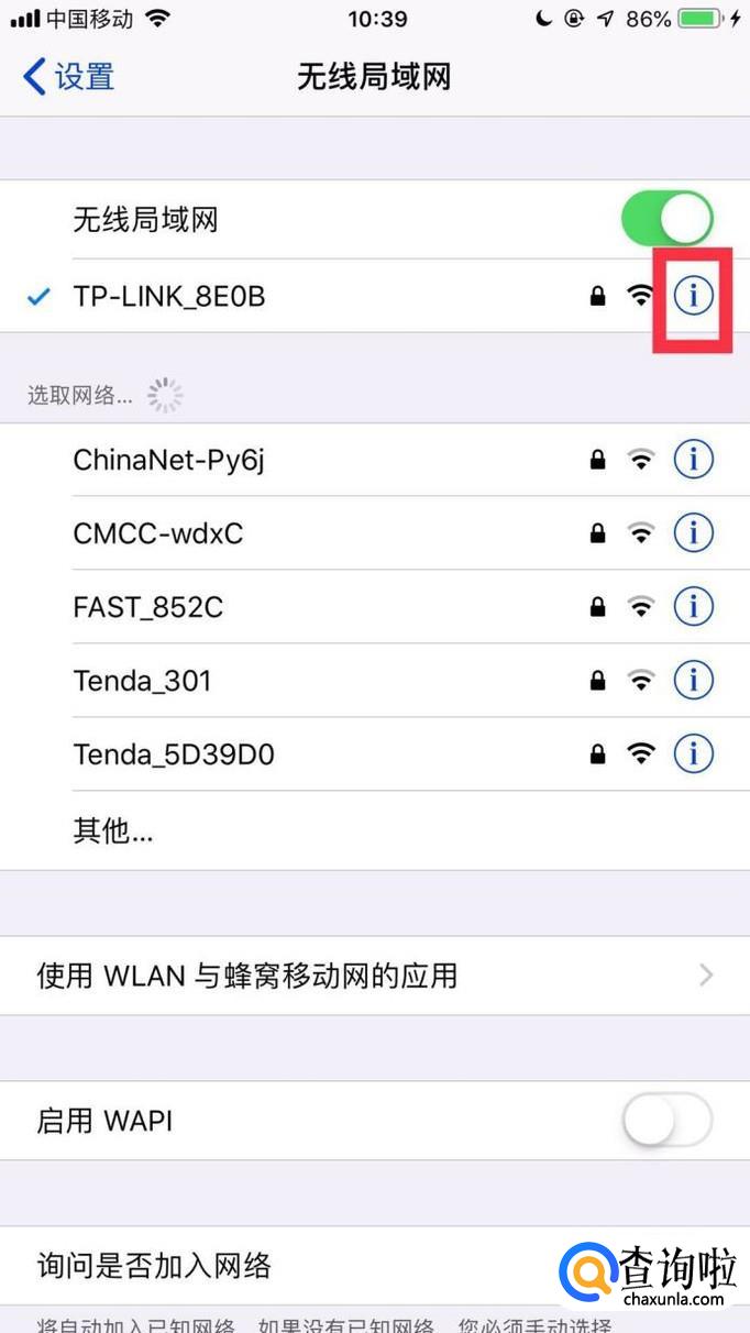 接着点击我们正在连接的无线局域网右侧的感叹号。