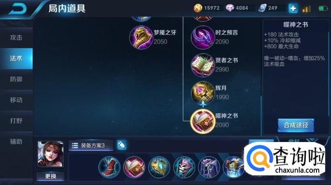 装备二:噬神之书。这件装备主要是提供的法术吸血,虽然貂蝉本来的吸血也是很强的,但是如果配合噬神之书的话她的吸血能力会进一步提升,对敌方脆皮尤为有效。