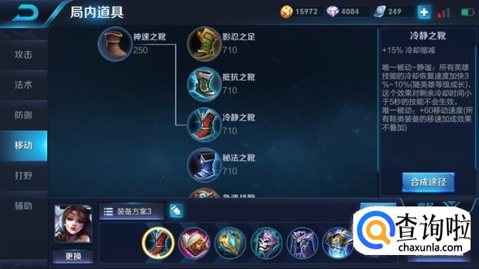 出装:第一件装备当然是买鞋子了,买冷却之靴,之前的冷却之靴是一件比较冷门的装备,因为它之前只能提供10冷却缩减,而现在多了最高10%的额外冷却缩减,可以说是很大的一个加强,很适合貂蝉需要大量技能的特点。