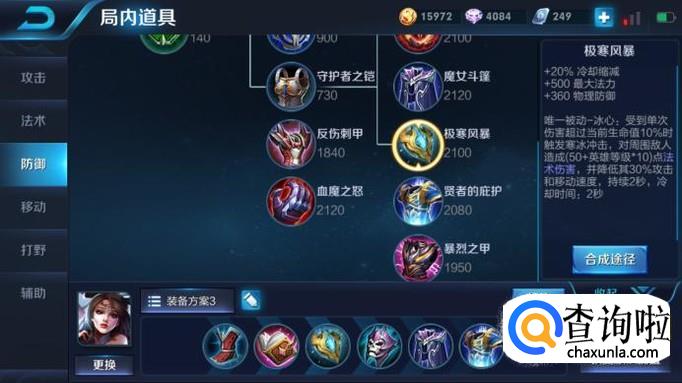 第三件装备:极寒风暴。这件装备可以提供360点的物理防御,同时还有20%的冷却缩减,再配合噬神之书和冷却之靴的冷却缩减效果,貂蝉可以直接到达冷却缩减的顶峰值40%。
