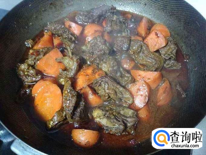 然后我们加入胡萝卜,翻炒均匀,加水适量,然后盖上锅盖,慢火闷煮大概30分钟,加入适量盐,味精,葱和蒜,起锅。