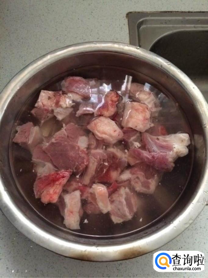 羊肉洗净,砍成小块儿,将其泡在温盐水中,在水中加适量的醋,大概泡半个小时。