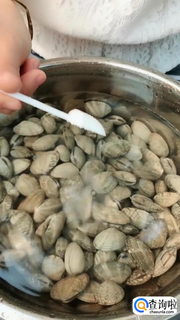 首先将买回来的花蛤放到容器当中并加入适量的盐浸泡2个小时,如下图所示。我们这样做是为了让花蛤能够更好的吐干净肚子中的泥沙。