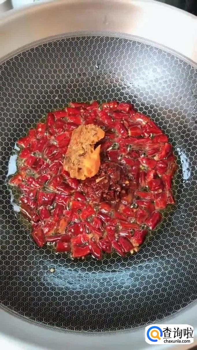 然后把干辣椒切成段倒入油锅中爆香,如下图所示。我们在爆香的过程中应该开小火。如果火开的太大是很容易让锅中的油炸开的,油贱到皮肤是很容易受伤的,这一点大家一定要注意。