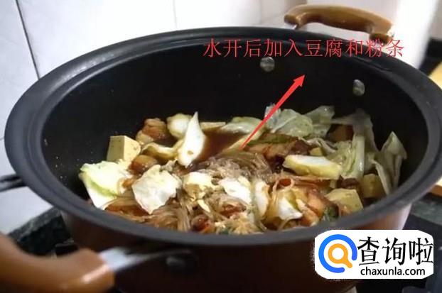 等到水开了以后我们就可以放入准备的豆腐和粉条了,如下图所示