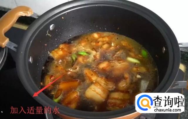 然后我们就可以往锅里加入水了,注意水的量刚没过五花肉即可,如下图所示