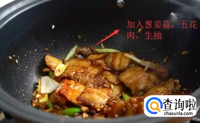 接下来放入葱姜蒜炒香,然后将切好的五花肉放入锅中翻炒,接着放入些许生抽并加入适量的盐,如下图所示