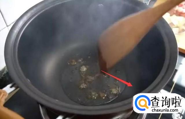 将砂锅放在煤气灶上,放入油,烧热,如下图所示