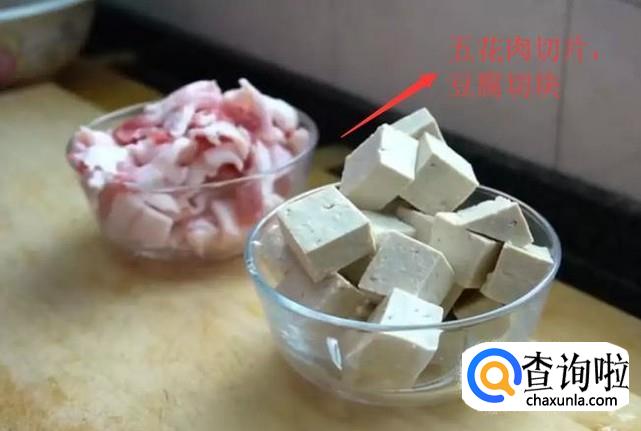 接下来将准备的五花肉切成片状,豆腐切成块状放在碗里备用,如下图所示