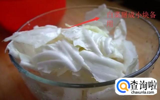 首先我们先将白菜掰成小块放在碗里备用,然后将粉条洗净在温水里泡,如下图所示