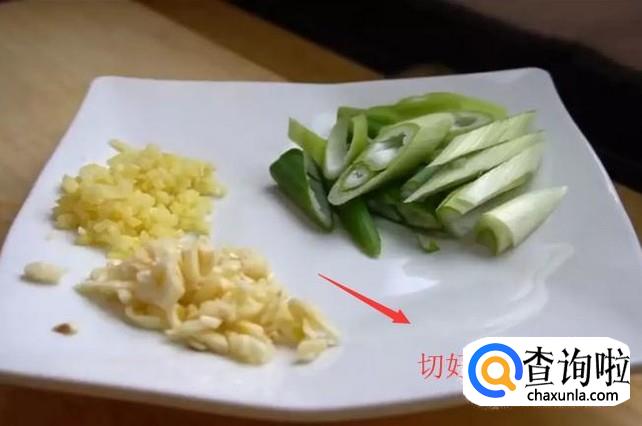 然后将从姜蒜切成如下图所示的形状放在盘里备用