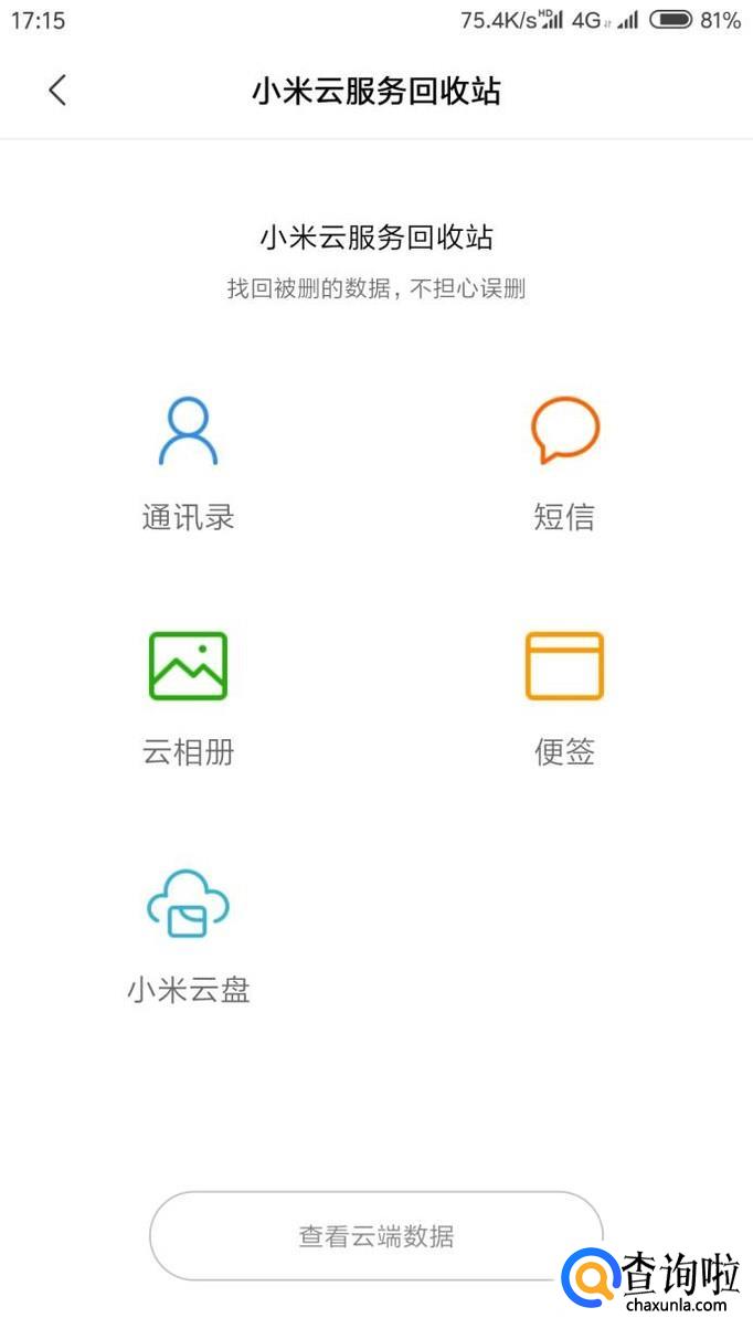 点击上方的图标可以查看近期删除的数据,点击最下方的‘查看云端数据‘可以查看备份的资料。