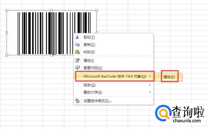 之后我们右击条形码,弹出的界面,我们选择Microsoft BarCode 控件14.0对象,之后我们点击属性;