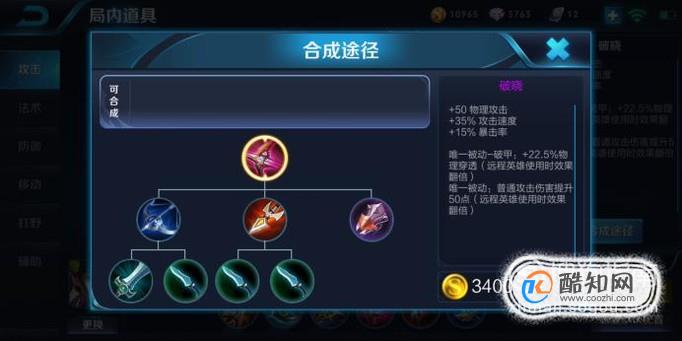 第五件装备是这个赛季射手的热门装备——破晓,它的属性是+50物理攻击,+35%攻击速度,+15暴击率。被动有两个,一是破甲,+22.5%的物理穿透,第二是普通攻击伤害提升50点,这两个被动远程英雄使用时效果翻倍。但其价钱高达3400金币,所以小编推荐大家前期先出一件穿云弓,中后期再补出大件。